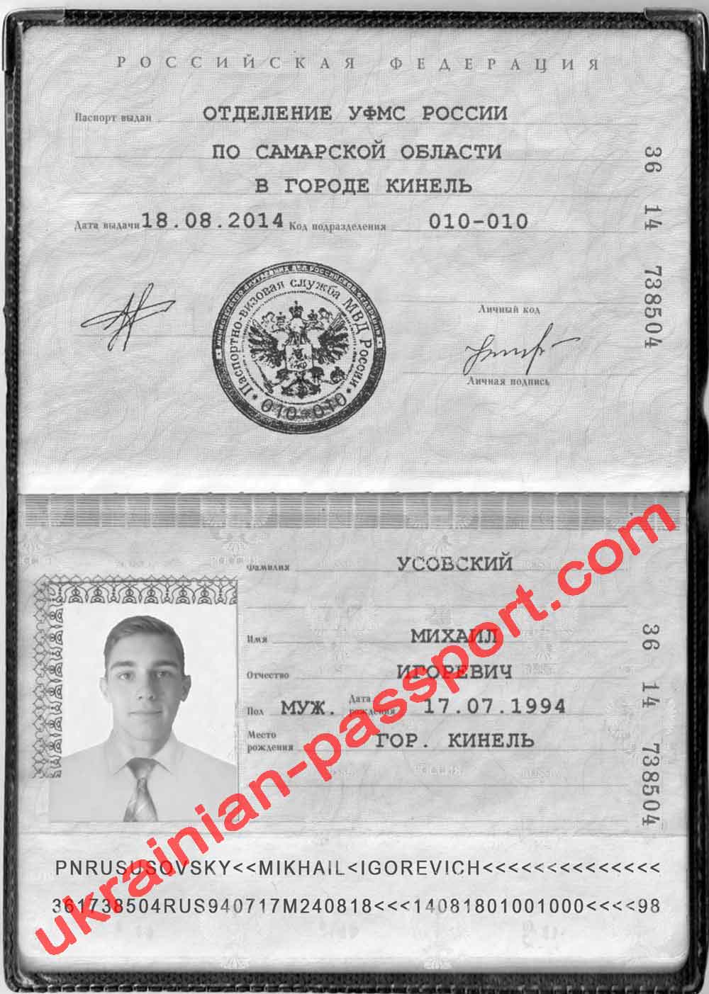 Esquema de fraude: Número de pasaporte ruso falso: 36 14 738504 Fecha de nacimiento: 17 de julio de 1994