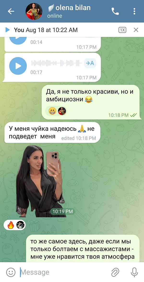 Esquema de fraude: La víctima conoció a esta mujer en el sitio “Seeking Arrangement” y la comunicación pasó rápidamente a Telegram, con mensajes escritos y de voz. Ella se mostró amable y cariñosa, asegurando que había química entre ambos y que quería conocerlo en persona.