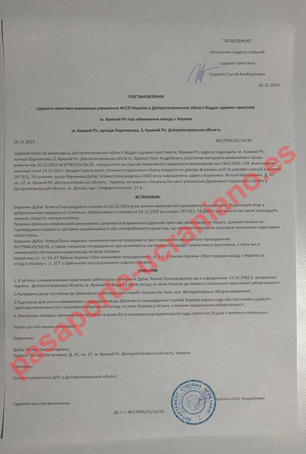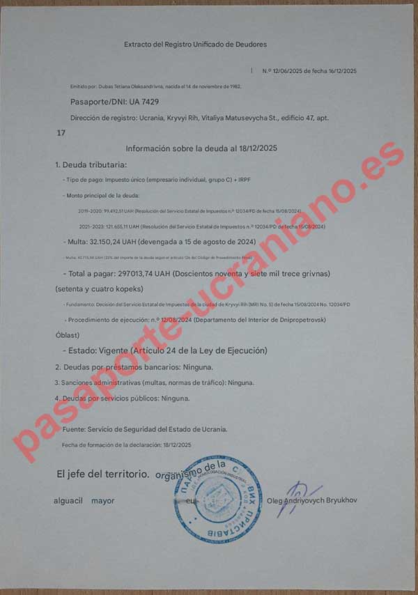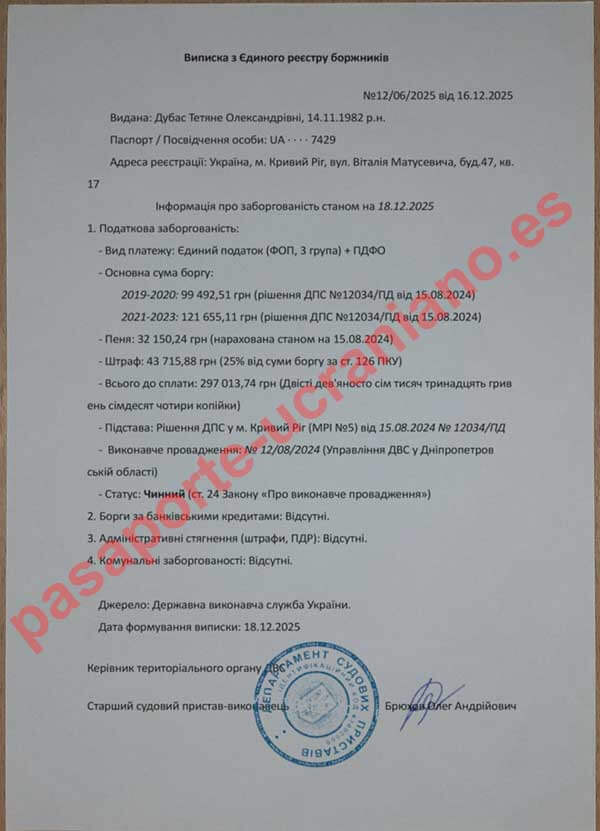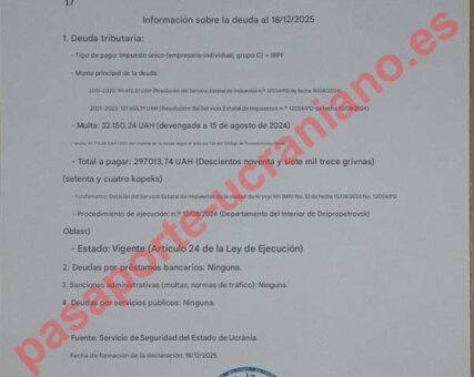 Documentos y pasaporte falsos: cuando la relación online avanza, ella envía copias de un supuesto pasaporte ucraniano y varias resoluciones oficiales. En esos documentos afirma que tiene prohibido salir de Ucrania hasta pagar una gran deuda tributaria de unos 7.000 euros. Este tipo de papeles se fabrica con datos reales mezclados con sellos y textos falsos. En casos así es clave una verificación independiente del pasaporte ucraniano y de los documentos adjuntos.